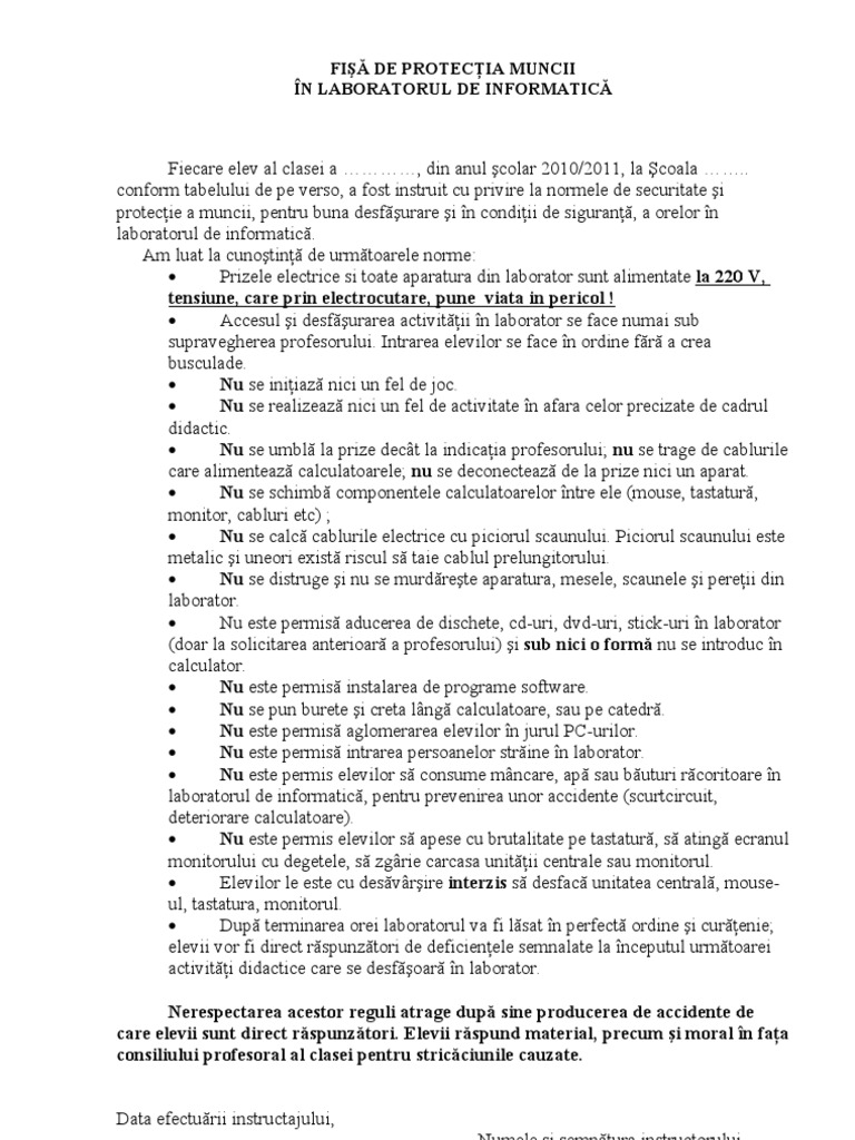 Accesul și activitatea în laborator se vor desfășura numai sub supravegherea profesorului. 4.toate experimentele se execută cu cantităţi mici de substanţe. Norme de protecţia muncii în laboratoarele şcolare laboratoarele şcolare sunt locurile în care studentii sunt mult expuşi riscurilor cauzate de existenţa reactivilor chimici, ustensilelor de laborator şi aparatelor electrice.