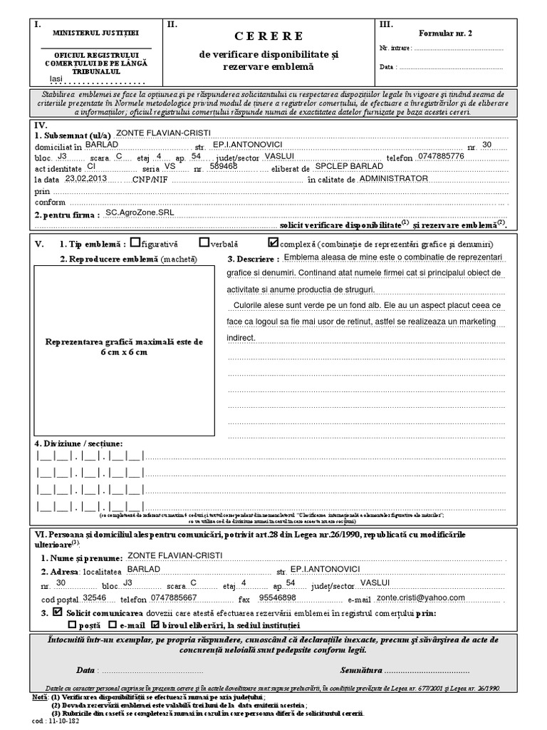 Cerere de verificare disponibilitate rezervare denumire firma pf. Cerere verificare disponibilitate şi/sau rezervare emblemă persoane juridice;
